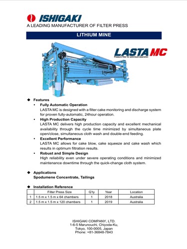 Ishigaki is a world leader in solid-liquid separation, offering innovative filtration and dewatering technologies for the mining, metals, wastewater, and industrial sectors. With its “Designed to Filter, Engineered for Life” philosophy, Ishigaki delivers advanced solutions such as the LASTA MC and LASTA SD filter presses, ISGK-A screw presses, and IFW polishing filters. These systems provide exceptional reliability, efficiency, and cake dryness—helping operations reduce costs and support sustainable water management. Applications include sludge dewatering, slurry thickening, industrial wastewater treatment, and mineral processing.